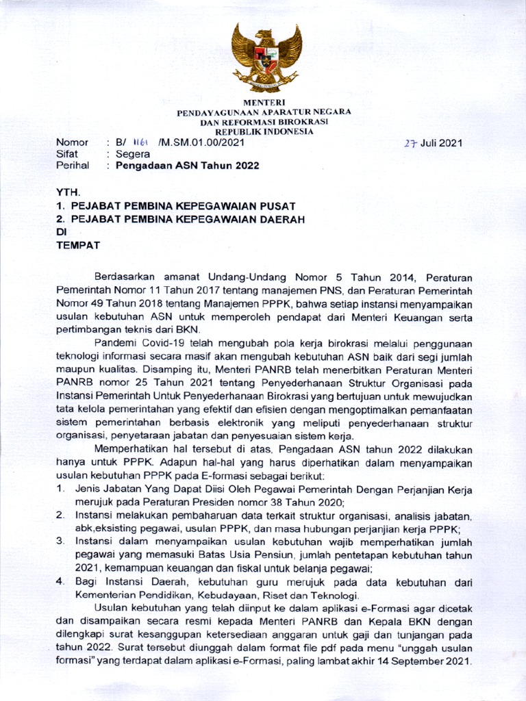 Berikut Surat Edaran Menpan RB Nomor B/1161/M.SM.01.00/2021 Tentang Pengadaan ASN Tahun 2022 Lengkap dan Jelas