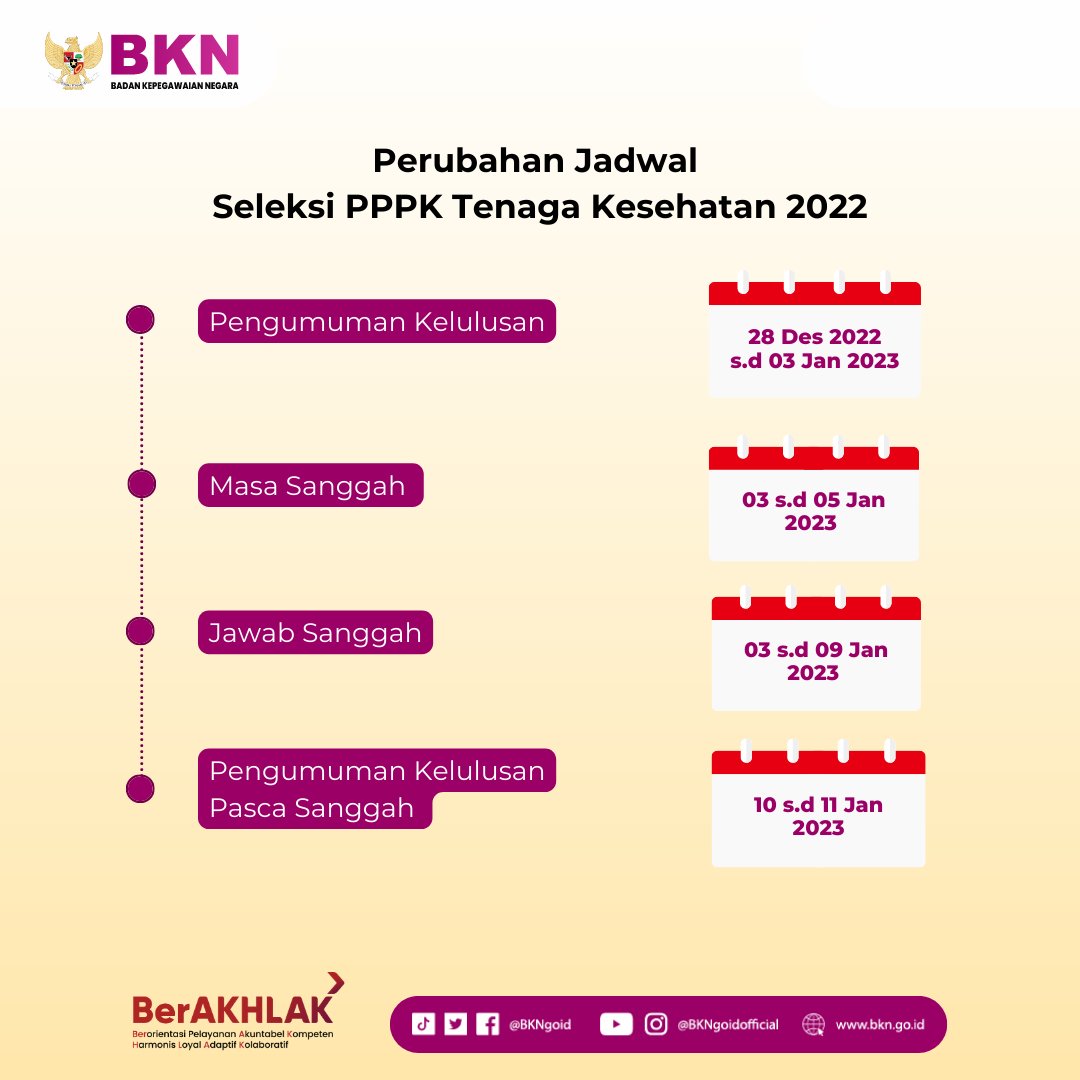 Penyesuaian Hasil Seleksi Penerimaan PPPK Tenaga Kesehatan Tahun 2022 Jangan lupa #SobatBKN cek berkala pengumuman hasil seleksi kalian pada kanal resmi masing-masing instansi dan sanggah hasil bisa dilakukan mulai besok. 😉 #ASNPelayanPublik #seleksipppk2022 Email ThisBlogThis!Share to XShare to Facebook