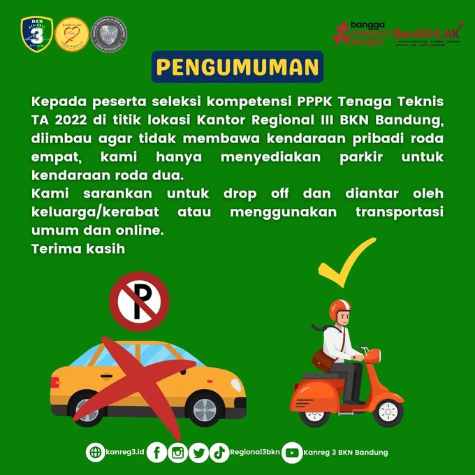 Informasi penting kami sampaikan kepada peserta seleksi kompetensi PPPK Tenaga Teknis di titik lokasi Kanreg III BKN bahwa tidak membawa kendaraan pribadi roda empat ke lokasi ujian karena kami tidak menyediakan parkir untuk kendaraan roda empat peserta ujian.