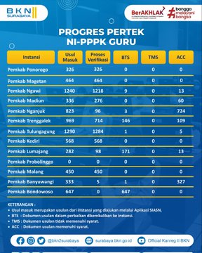 Update Pertek NI PPPK Guru Per 29 Mei 2023 Mimin hadir merubah segalanya, menjadi lebih indah... 🎤🎤Jiaaah mimin tau kok yg bisa membuat Senin kalian lebih indah ya cuma update Pertimbangan Teknis NI-PPPK Guru bukan??Cus langsung cek progress tiap instansi berikut #SobatBKN 😉 #pppkguru #ASNBerAKHLAK #banggamelayanibangsa Email ThisBlogThis!Share to XShare to Facebook