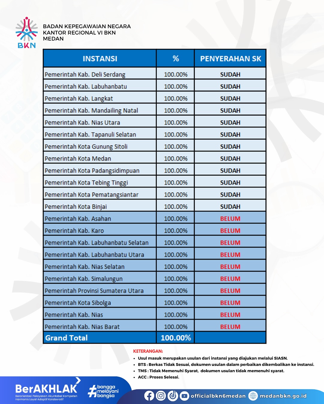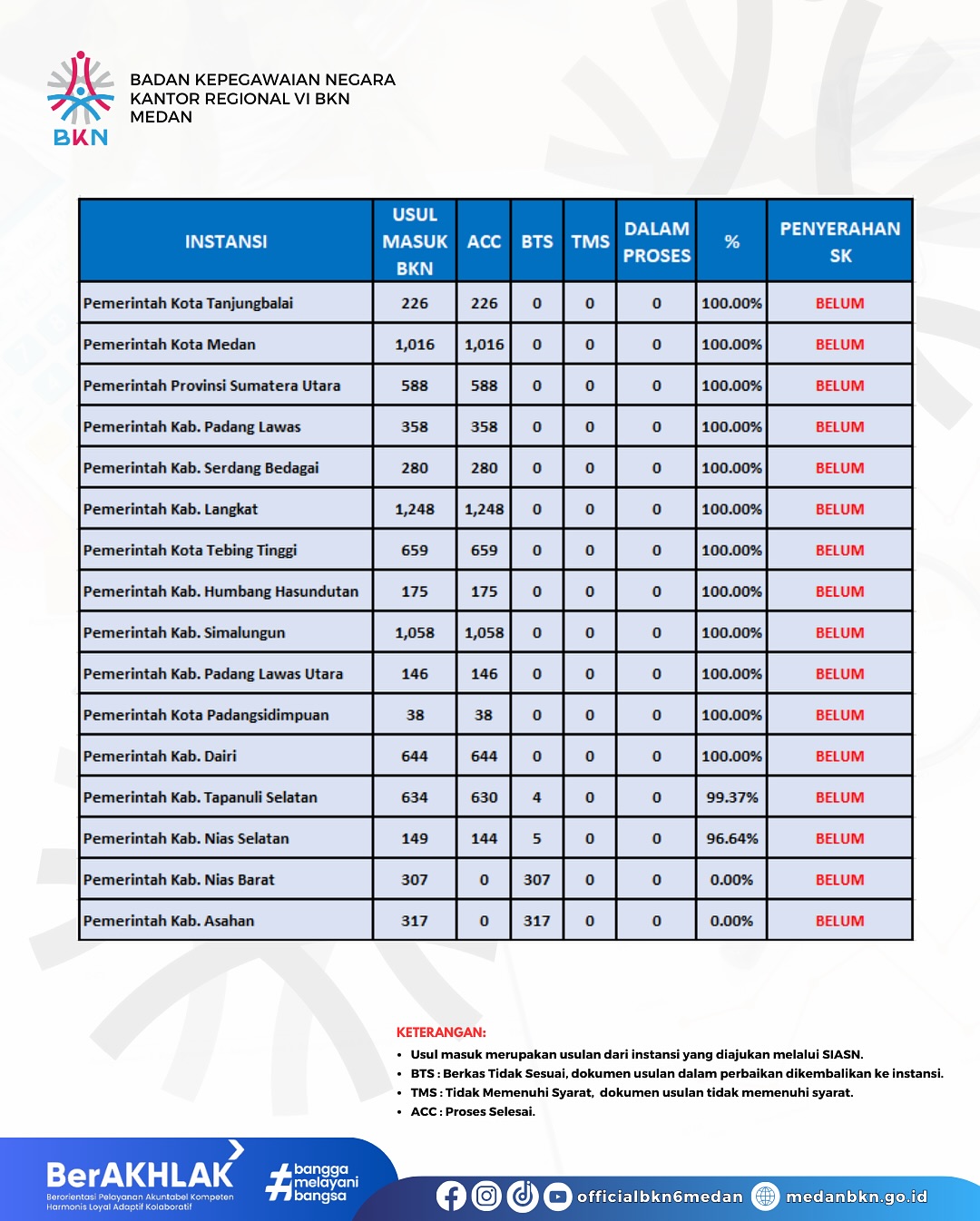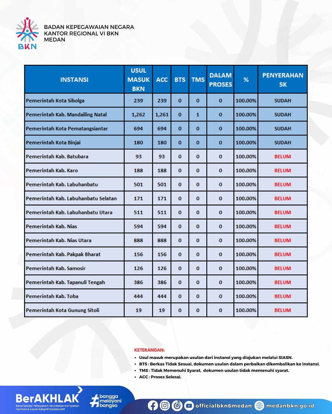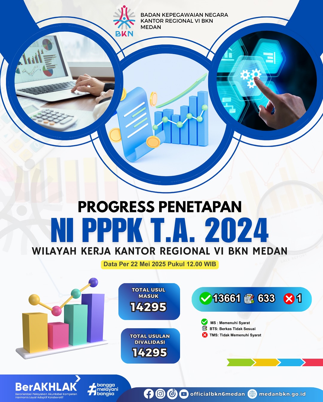 #sobatbkn Berikut kami sampaikan progress penetapan NI PPPK T.A. 2024 di Wilayah Kerja Kantor Regional VI BKN Medan Per Tanggal 22 Mei 2025.