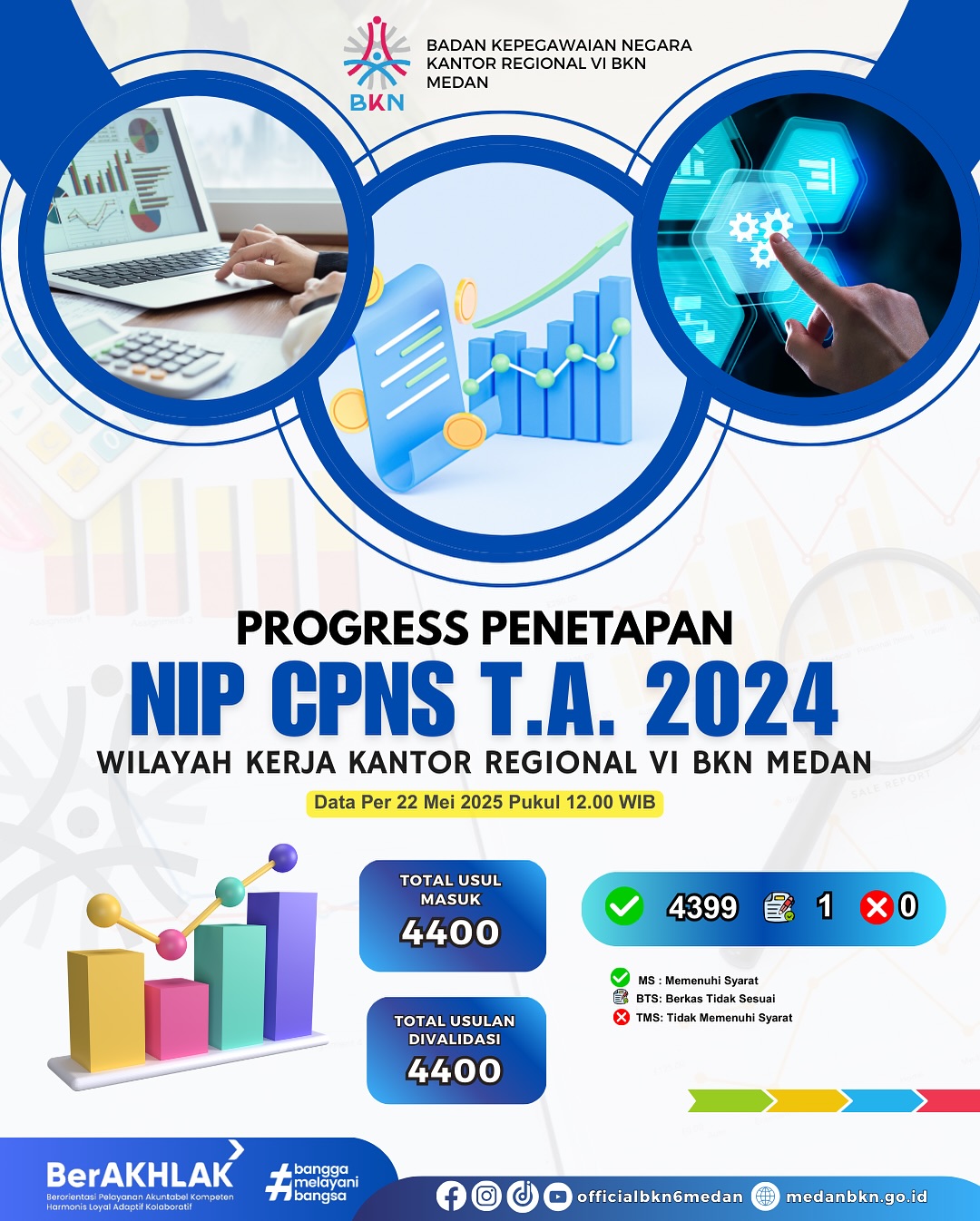 #sobatbkn Berikut kami sampaikan progress penetapan NIP CPNS T.A. 2024 di Wilayah Kerja Kantor Regional VI BKN Medan Per Tanggal 22 Mei 2025.