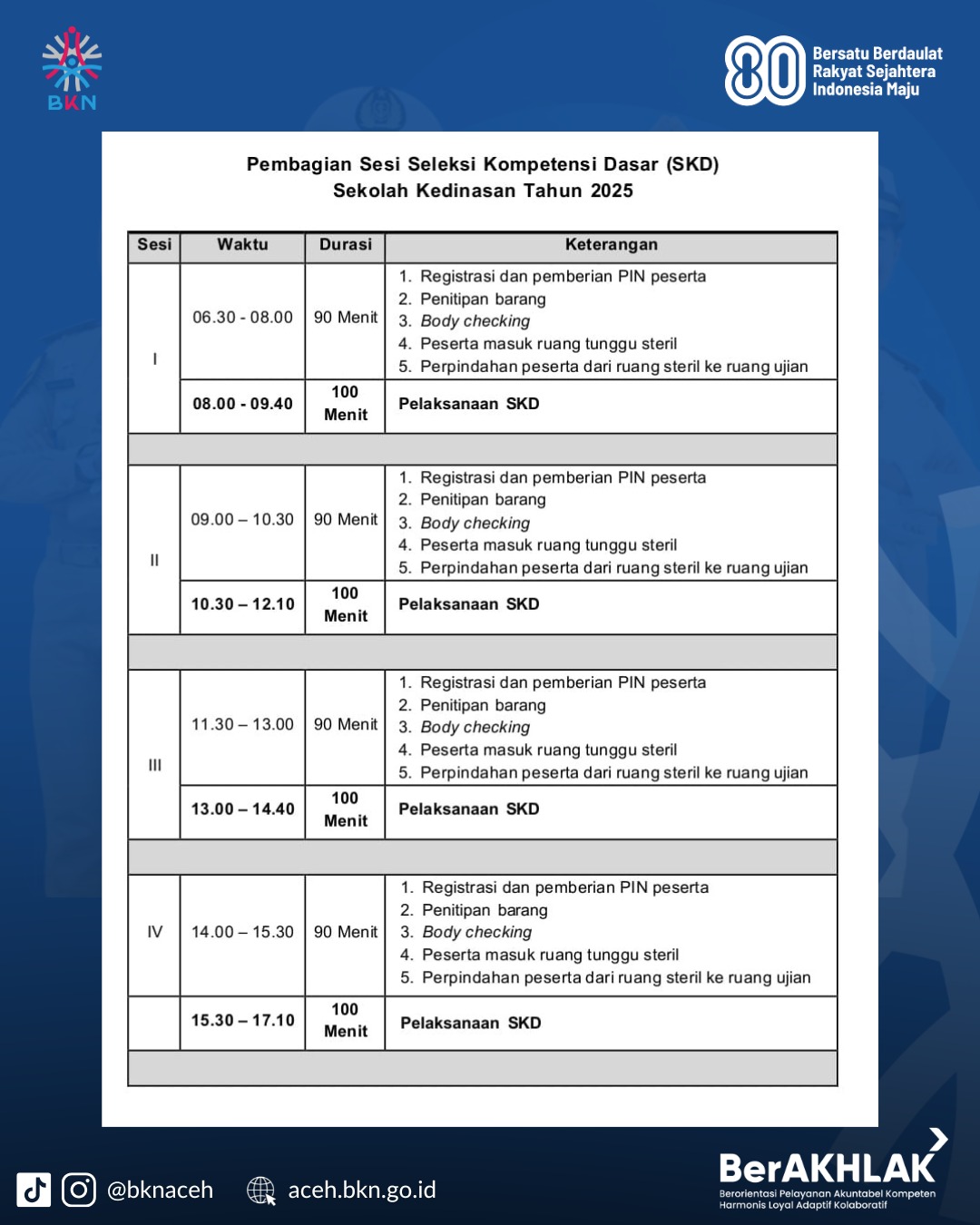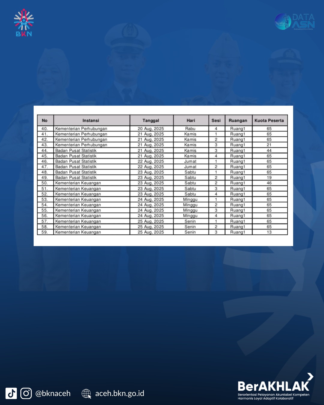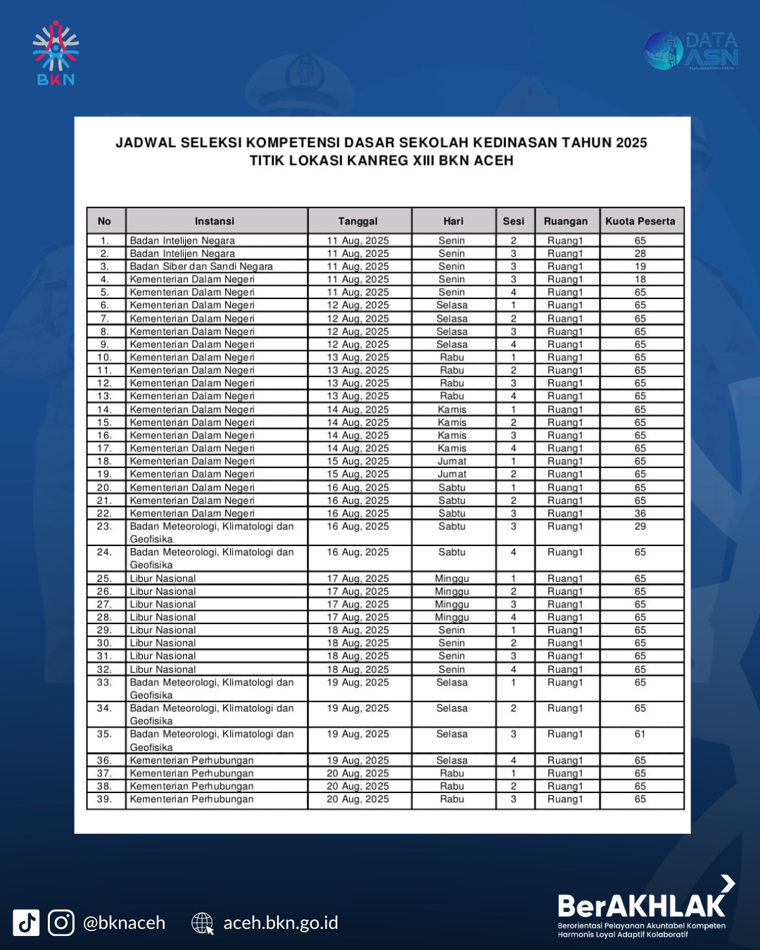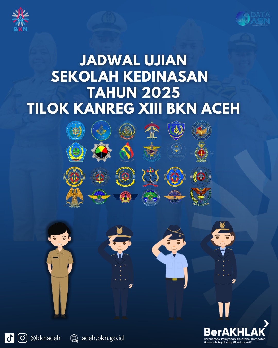 Jadwal Ujian Sekolah Kedinasan Tilok Kanreg XIII BKN Aceh Rakan ASN berikut kami sampaikan Jadwal Ujian Sekolah Kedinasan untuk Titik Lokasi Kantor Regional XIII BKN Aceh, semangat dan persiapakan !! Email ThisBlogThis!Share to XShare to Facebook