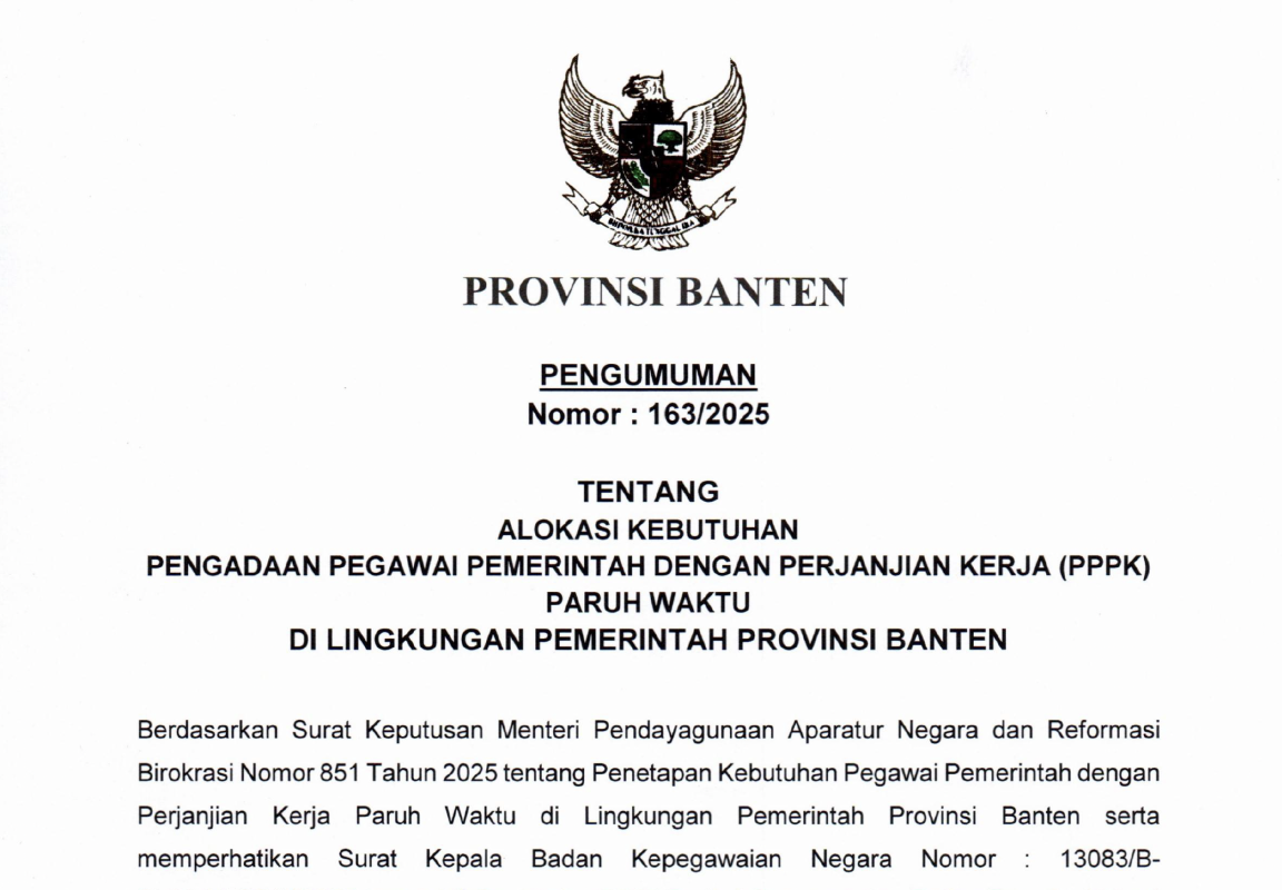 Berdasarkan Surat Keputusan Menteri Pendayagunaan Aparatur Negara dan Reformasi Birokrasi Nomor 851 Tahun 2025 tentang Penetapan Kebutuhan Pegawai Pemerintah dengan Perjanjian Kerja Paruh Waktu di Lingkungan Pemerintah Provinsi Banten serta memperhatikan Surat Kepala Sadan Kepegawaian Negara Nomor : 13083/BSl.01 .01/SD/K/2025 tanggal 6 September 2025 Perihal Penyampaian Daftar Peserta Alokasi PPPK Paruh Waktu, bersama ini kami sampaikan informasi sebagai berikut :