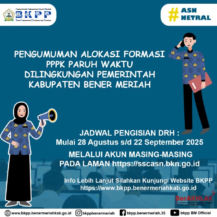 PENGUMUMAN ALOKASI FORMASI PPPK PARUH WAKTU DILINGKUNGAN PEMERINTAH KABUPATEN BENER MERIAH